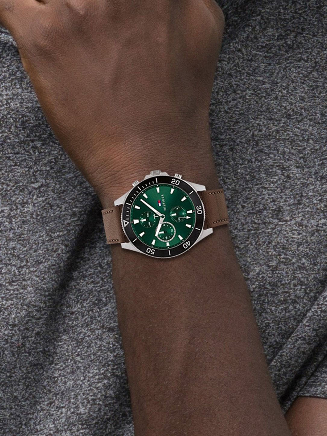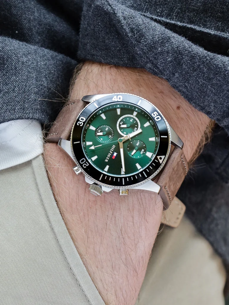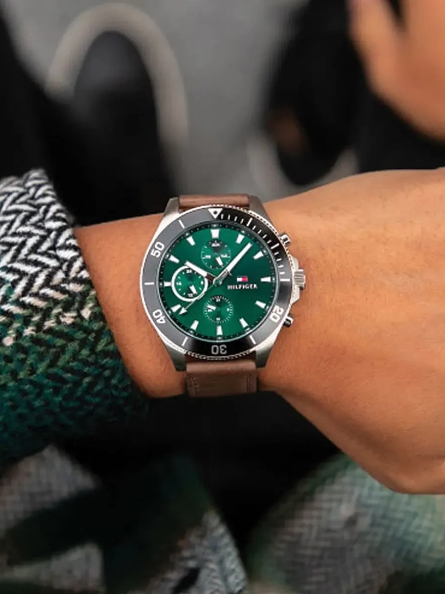 Tommy Hilfiger Larson pour Homme Cadran Vert Soleillé & Bracelet Cuir Marron