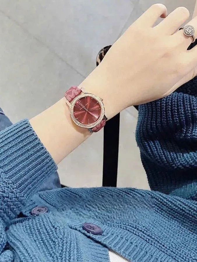 Cadran rouge avec finition soleillée et lunette sertie de cristaux